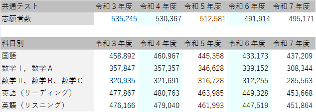 一方、共通テスト(旧センター試験)の受験者数は明らかに減少傾向です。