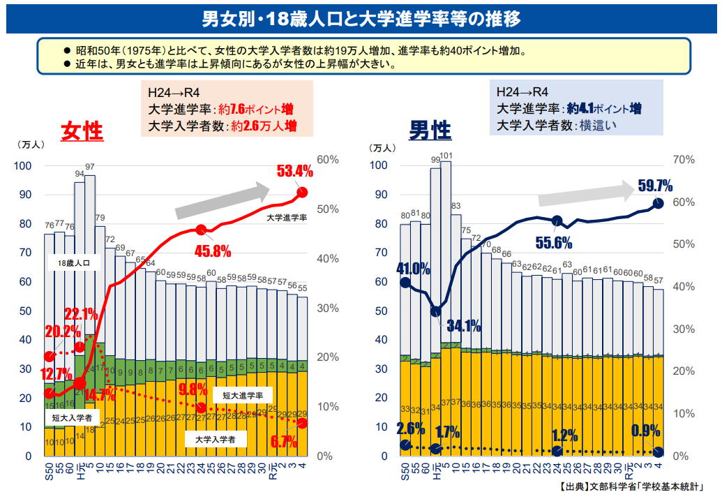 上のグラフのように大学進学者数も進学率も、少子化にもかかわらず近年わずかに増えています。